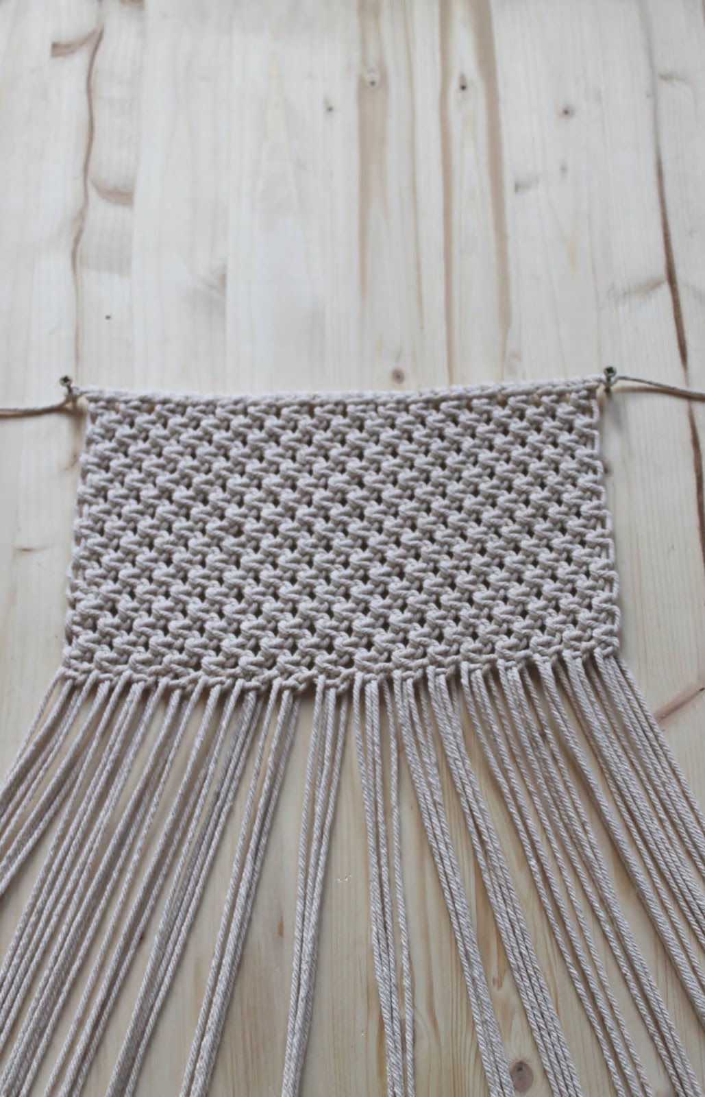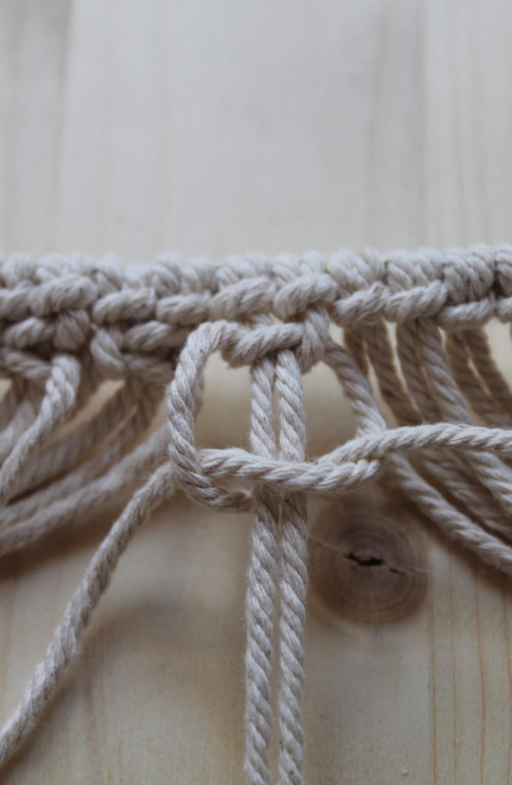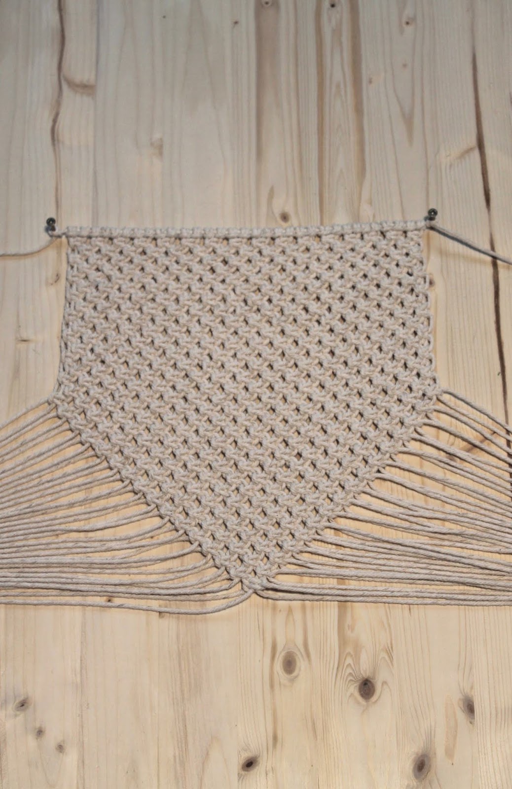 Gestartet wird mit einer ganzen Reihe Kreuzknoten, danach mit einer versetzten. Ich habe 17 Reihen im Wechsel geknotet, die mit einer ganzen Reihe Kreuzknoten endet.