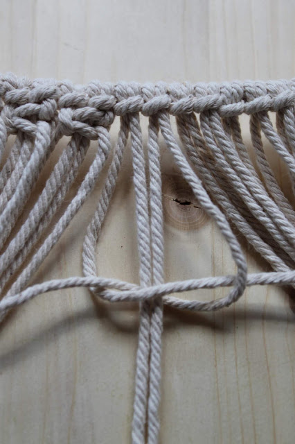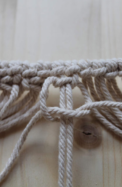 Die erste Reihe Kreuzknoten wird aus vier Fäden von zwei Lerchenkopfnoten gemacht.