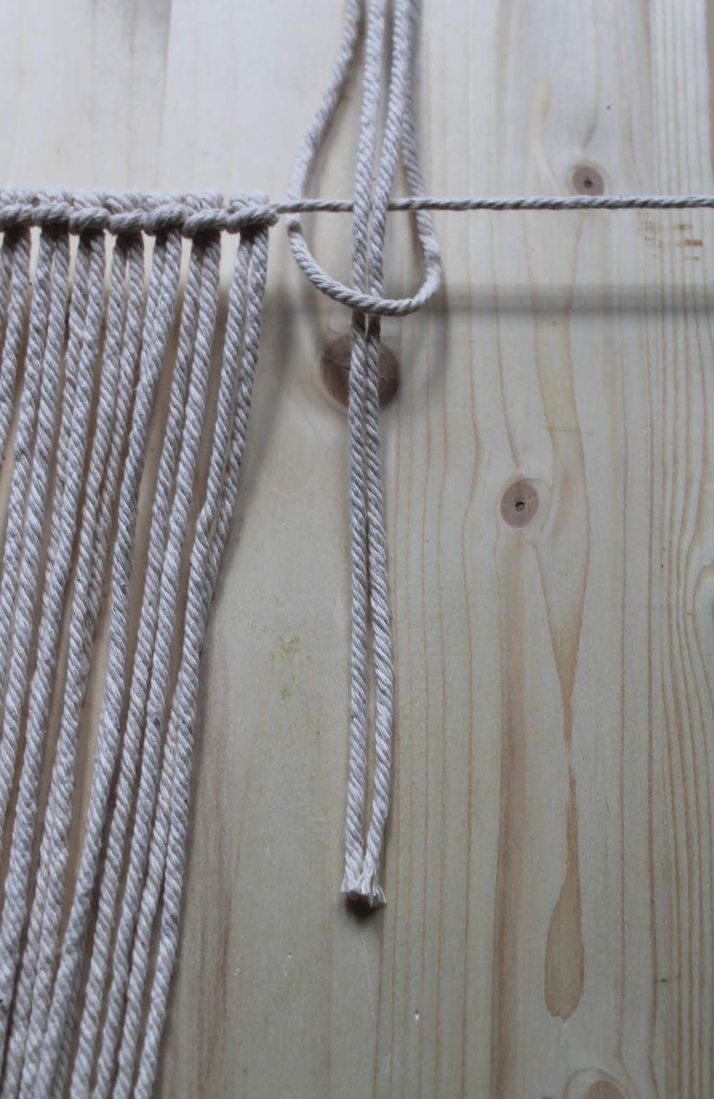 Schrauben oder Nägel mit einem Abstand von 27 cm auf ein Holzbrett fixieren. Anschließend einen Makramee Faden mit doppelten Knoten an den Schrauben fixieren und den Faden so fest wie möglich spannen.