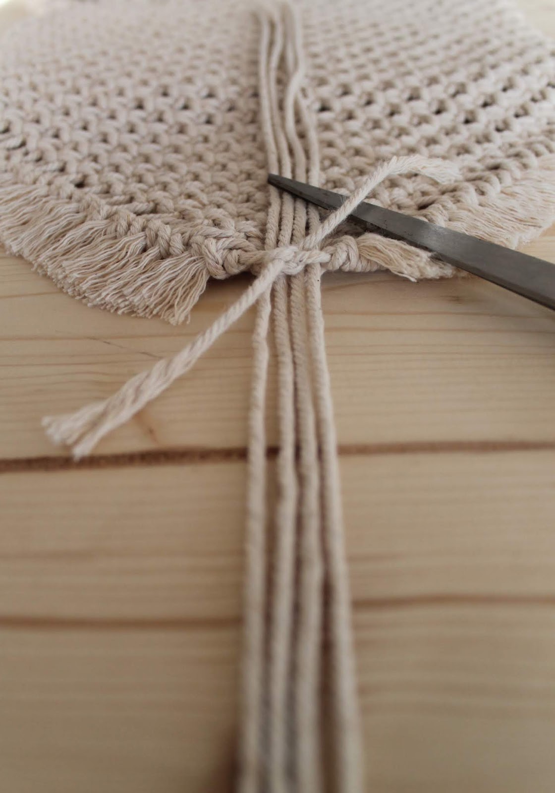 Jeweils immer vier Fäden zusammen knoten, kürzen und mit einem Kamm ausfransen.