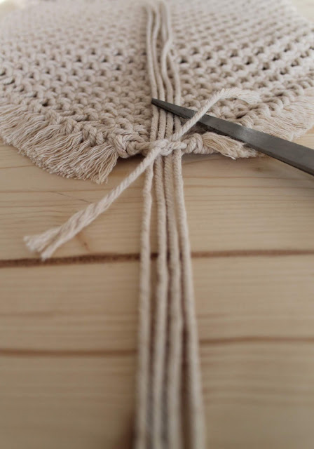 Die Basisknoten für meine Makramee Tasche sind der umgedrehte Lerchenkopfnoten, Kreuzknoten und halbe Schläge. Diese Knoten habe ich bereits für meinen Wimpel verwendet und jetzt auch für die Tasche. Meine Tasche besteht aus zwei Teilen.