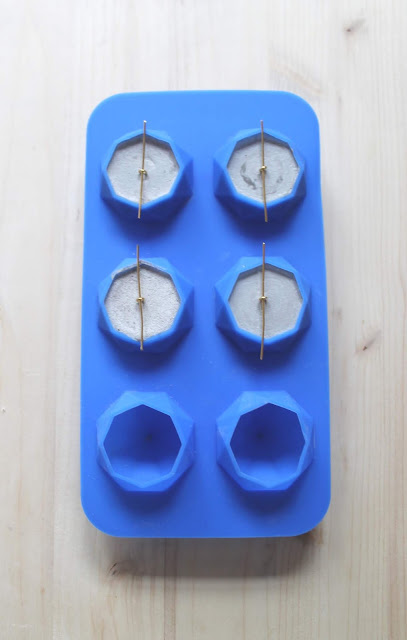 Hier habe ich im ersten Schritt Beton eingefüllt und die Eiswürfelform schräg gestellt, indem ich etwas Zeitungspapier unter die Form gelegt habe.
