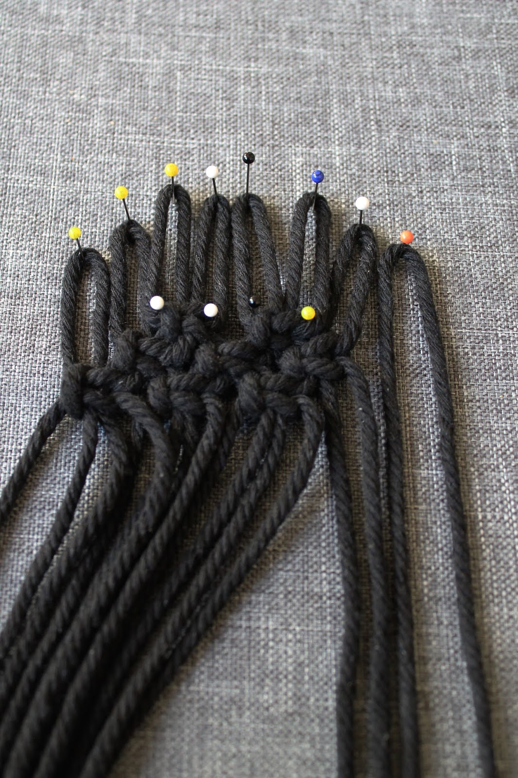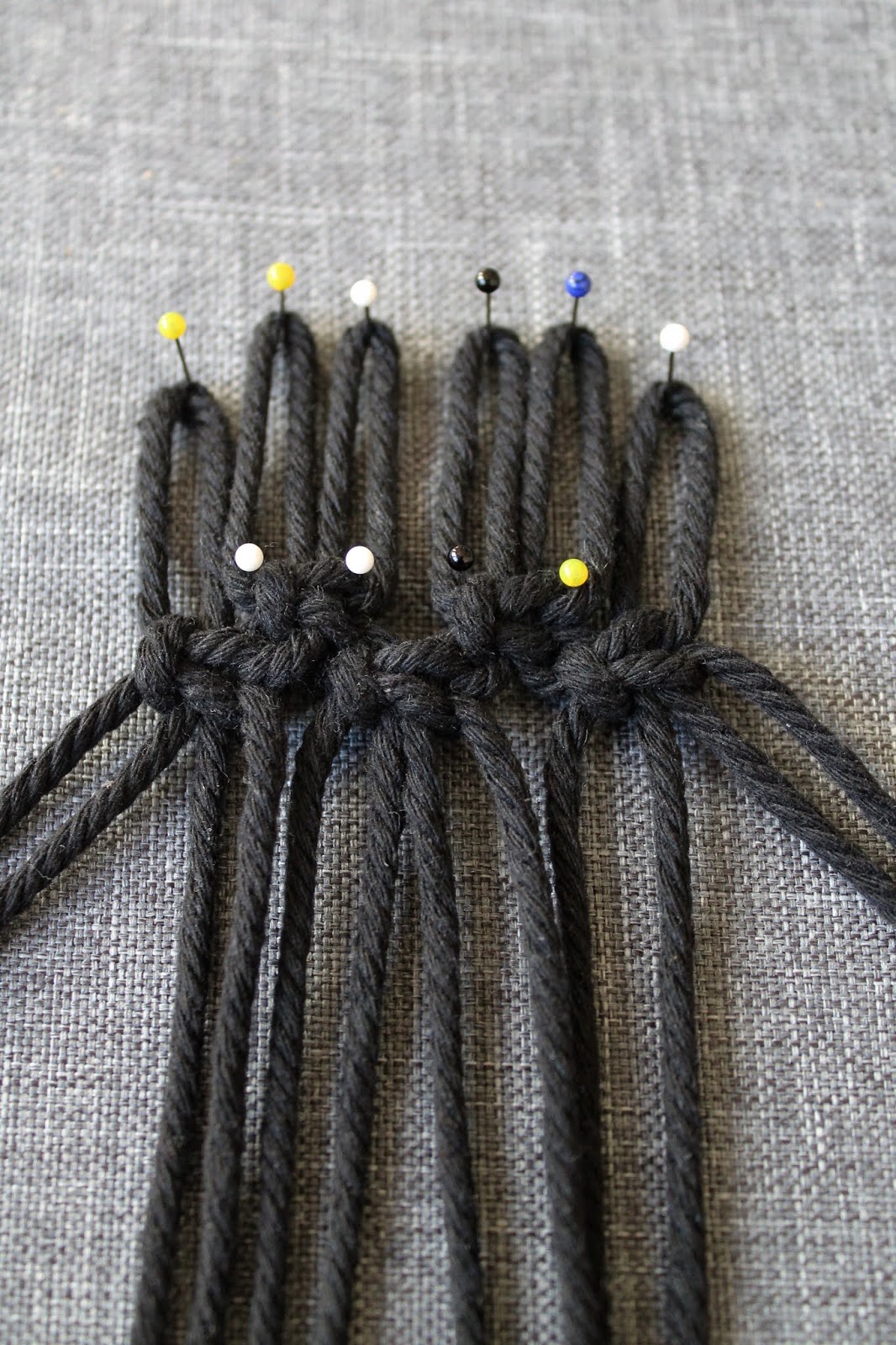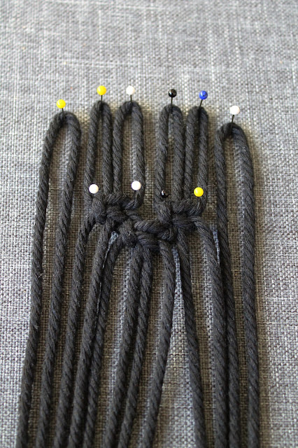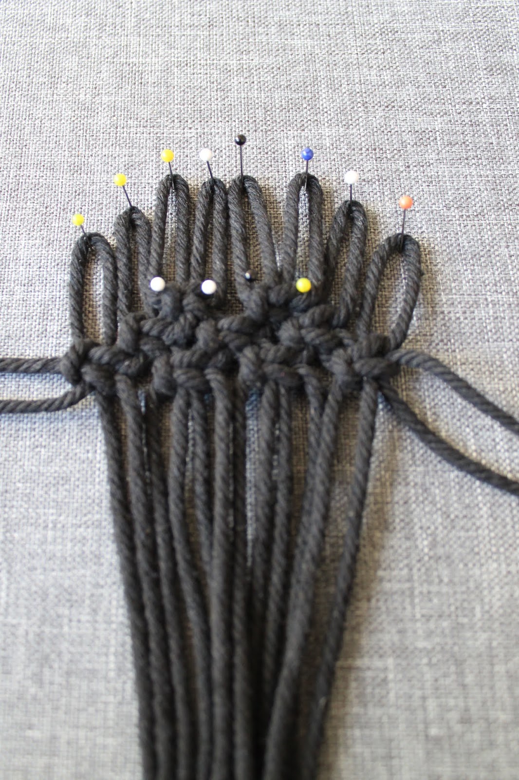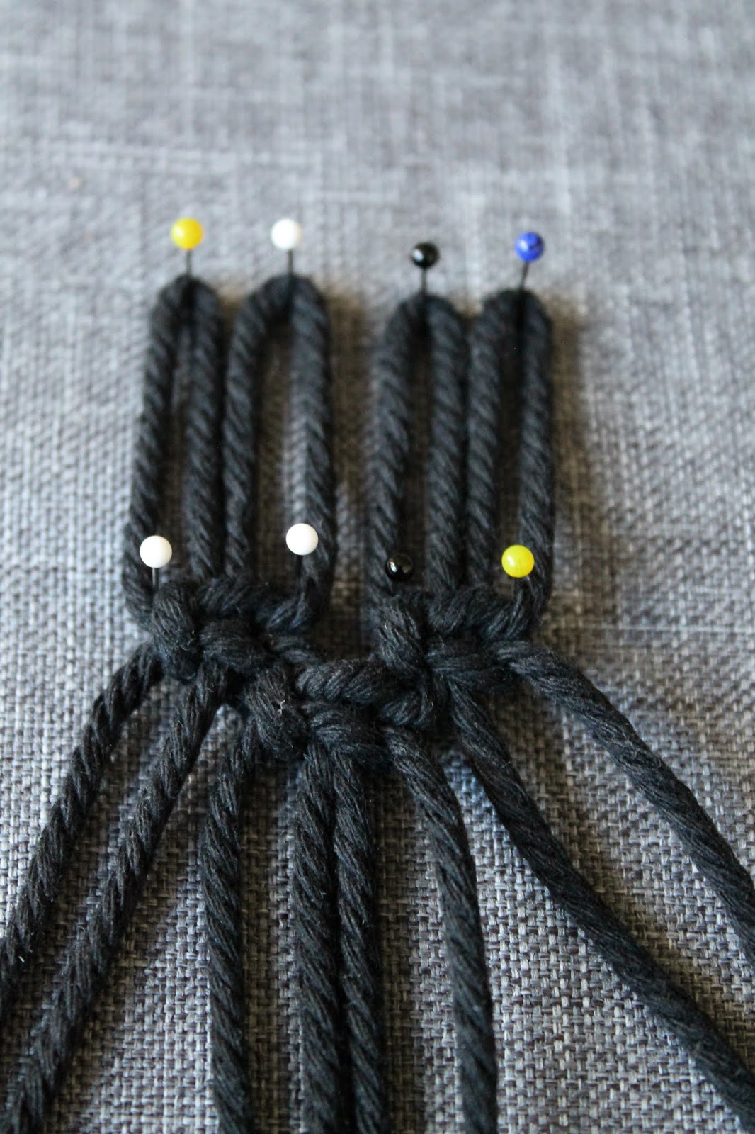 Zwei Stecknadeln leicht versetzt stecken. Garn erneut doppelt legen und mit den äußeren vier Fäden rechts und links zwei Kreuzknoten knüpfen.