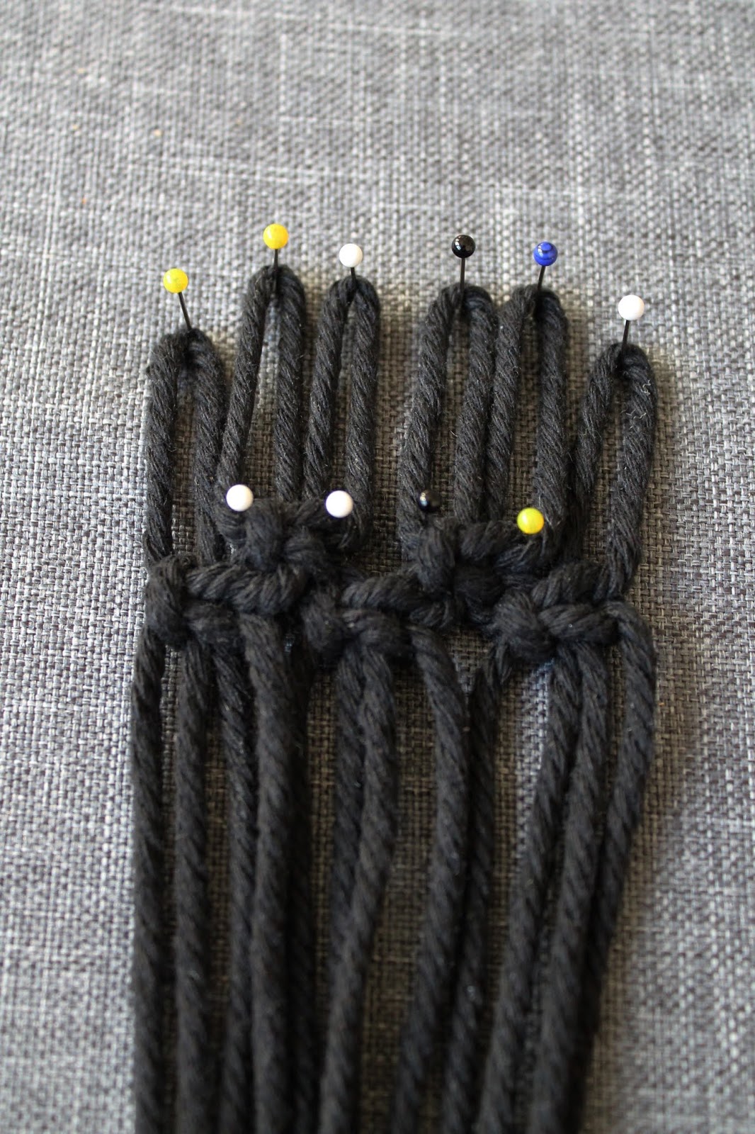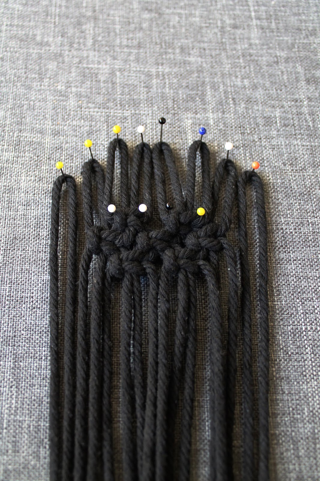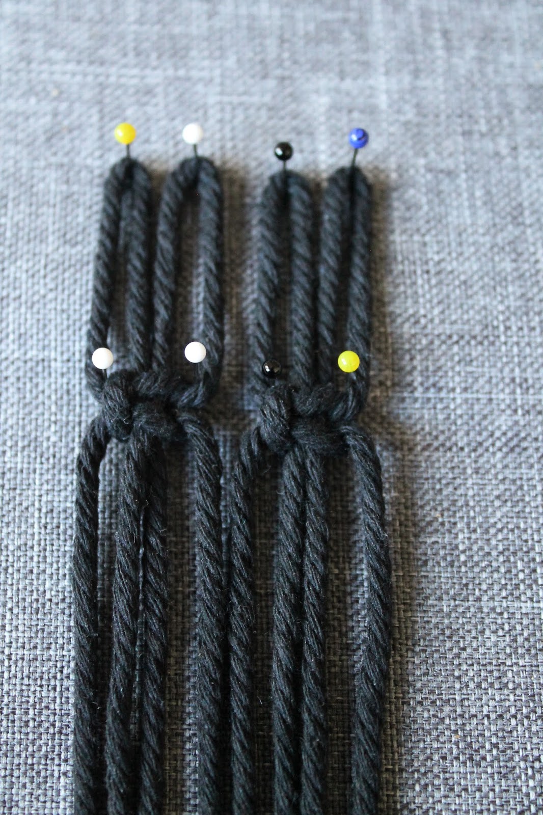 Zwei Stecknadeln leicht versetzt stecken. Garn erneut doppelt legen und mit den äußeren vier Fäden rechts und links einen Kreuzknoten knüpfen.