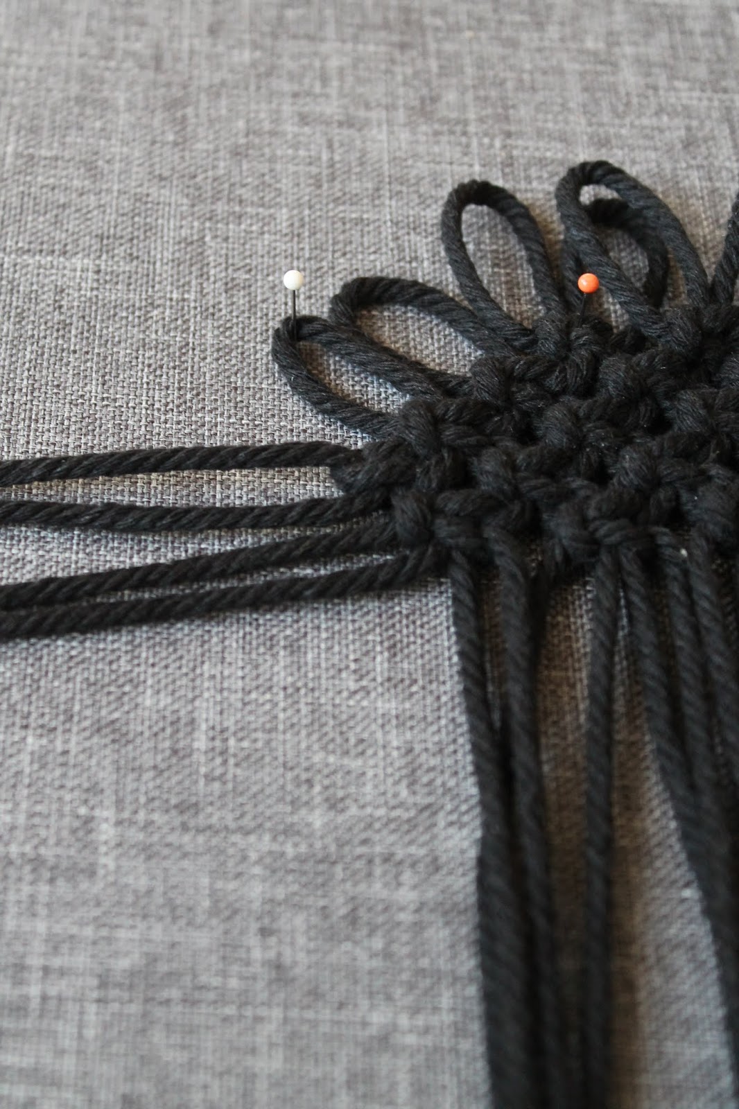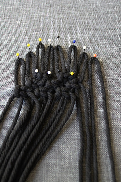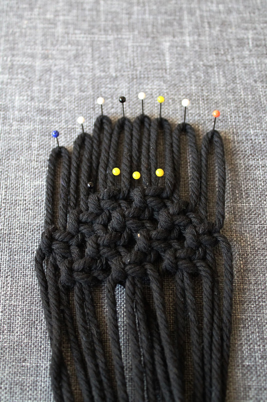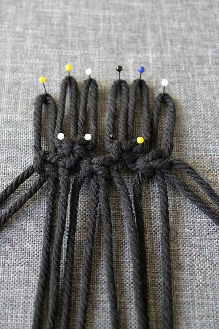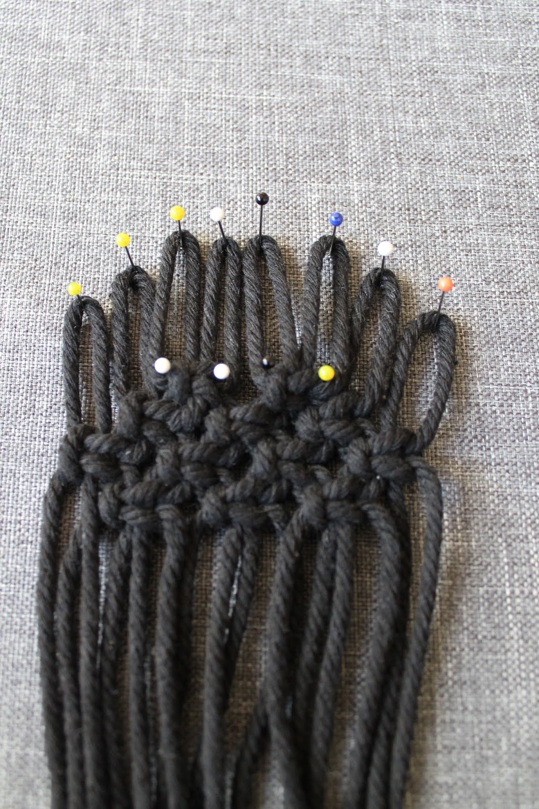 Zwei Stecknadeln leicht versetzt stecken. Garn erneut doppelt legen und mit den äußeren vier Fäden rechts und links einen Kreuzknoten knüpfen.
