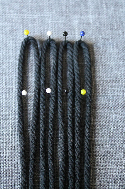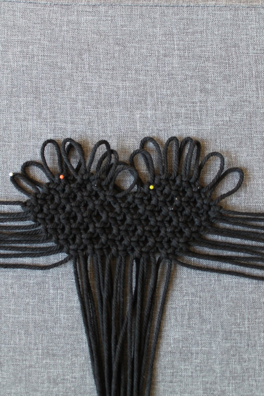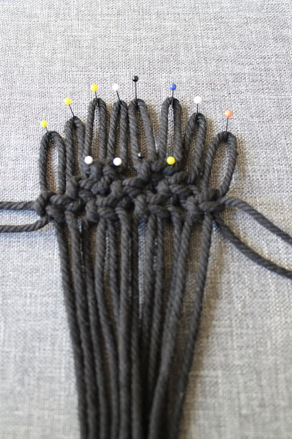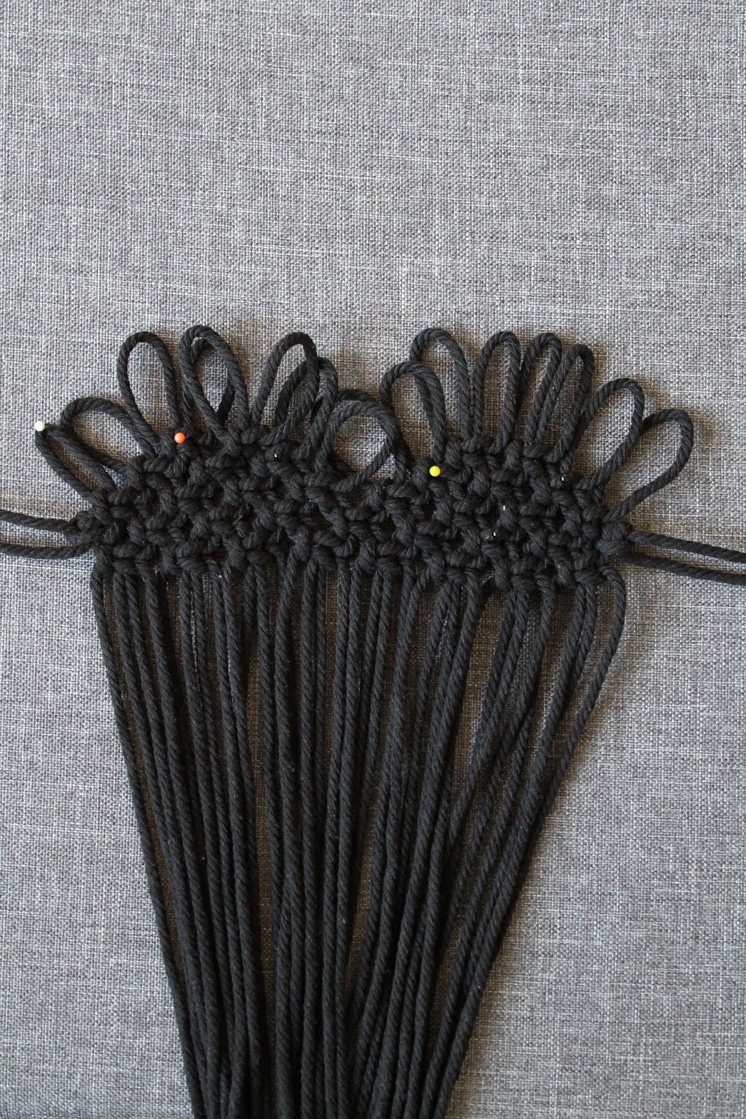 Stecknadeln aus den Schlaufen entfernen und beide Seiten mittig aneinanderlegen und mit Stecknadeln noch einmal zum Knüpfen fixieren.