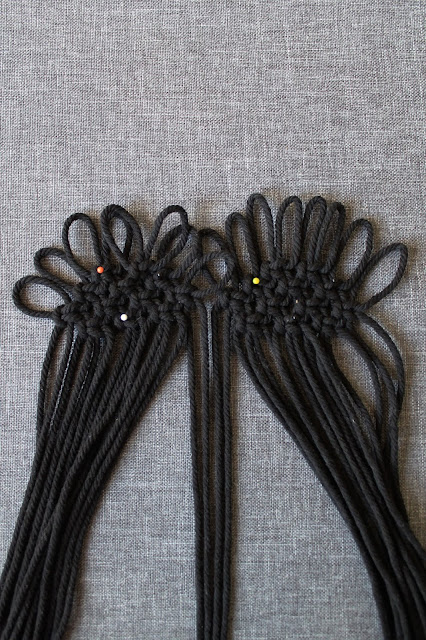 Die beiden Fäden rechts und links abteilen und insgesamt eine Reihe