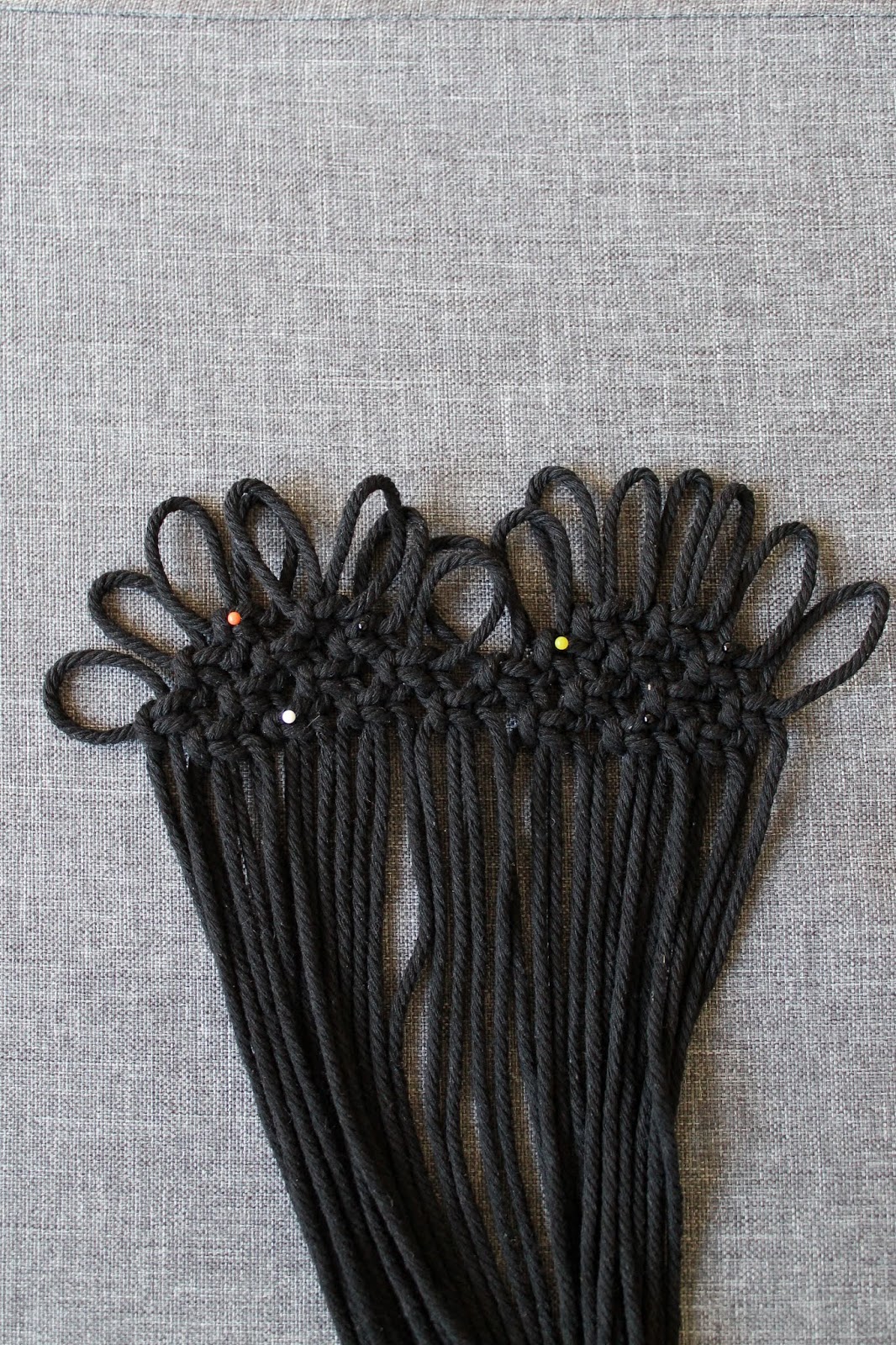 Dieser Knoten sichert die oberste Reihe ab und schließt später eine sonst entstehende Lücke beim Auskämmen der Garnenden.