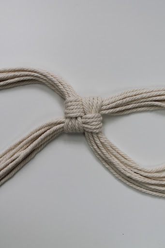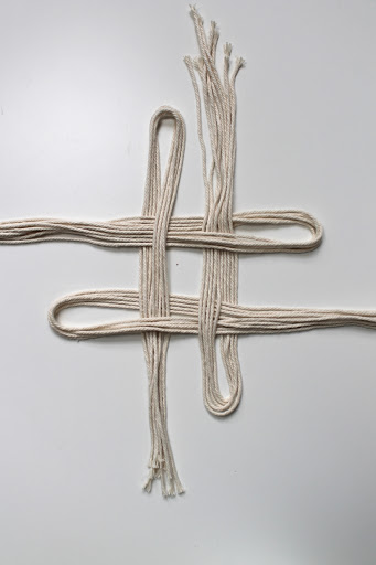 Für die Quaste/Tassel werden je 20 gleich lange Makramme Fäden benötigt. Je fünf doppelt legen und wie auf dem Bild zusammenlegen.