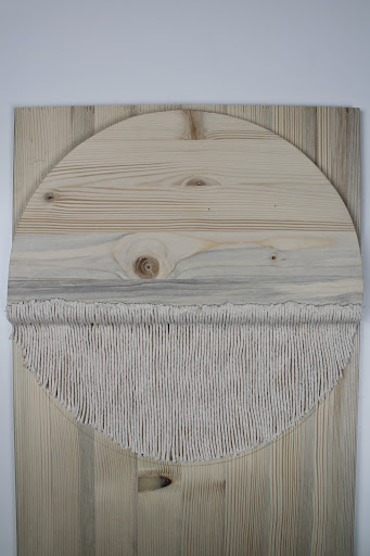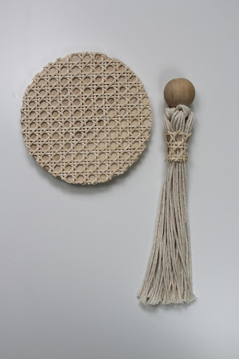 Materialien Holz, Stichsäge, Heißklebepistole, Makramee Garn, Wiener Geflecht.