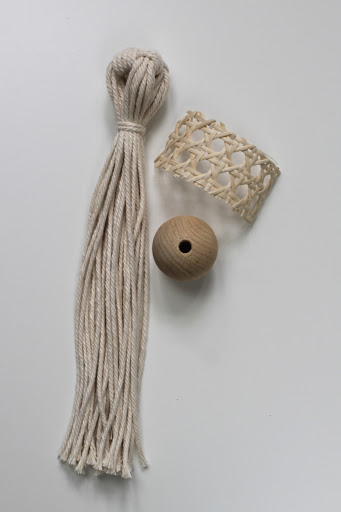 Abbinden und ein Stück Wiener Geflecht um das Makramee Garn legen. Alle Teile zusammenkleben und die fertige Tassel/Quaste auf das Wiener Geflecht kleben.