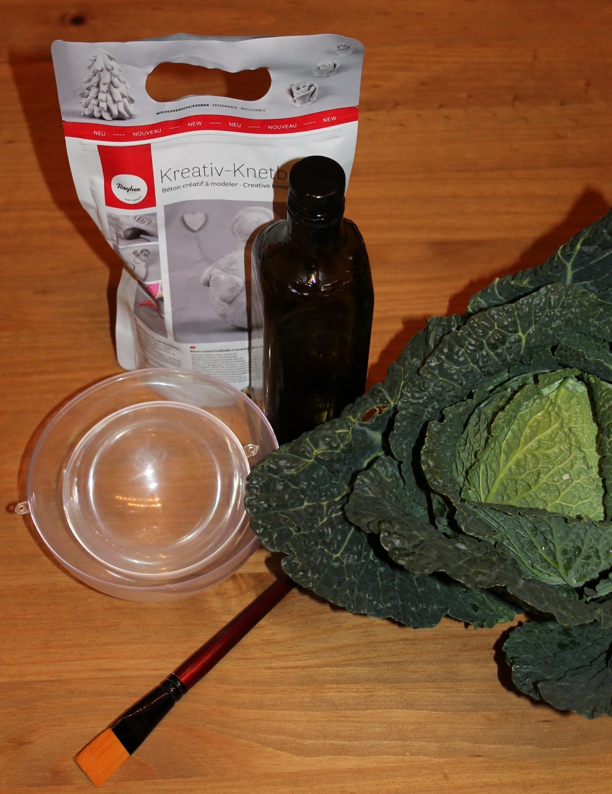 Wirsing, Acrylkugeln, Speiseöl, Pinsel.